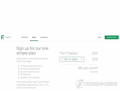 △ 구글 이동통신 '프로젝트 파이'…무제한통화에 기본료 20달러 (샌프란시스코=연합뉴스) 임화섭 특파원 = 세계 최대 인터넷 기업 구글은 '프로젝트 파이'라는 이동통신 서비스 상품을 미국에서 내놓기로 했다고 22일(현지시간) 밝혔다. 무제한 음성·무제한 문자 서비스는 월 20달러(2만1천600원), 데이터는 1 기가바이트(GB)에 10달러(1만800원)이며 사용하지 않은 데이터 요금은 달러 단위로 돌려준다. 약정 등 조건은 없다. 화면은 구글의 프로젝트 파이 가입신청 페이지. 2015.4.23 solatido@yna.co.kr
