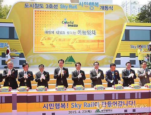 △ 대구도시철도 3호선 개통 (대구=연합뉴스) 한무선 기자 = 23일 대구시 수성구 황금동 어린이회관 광장에서 대구도시철도 3호선이 개통식이 열렸다. 2015.4.23 mshan@yna.co.kr