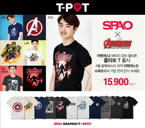(서울=연합뉴스) 이유미 기자 = 이랜드의 SPA(제조·유통 일괄형) 브랜드 '스파오'는 영화 어벤져스2 개봉에 맞춰 14가지 디자인의 어벤져스 캐릭터 티셔츠를 출시했다고 23일 밝혔다.
