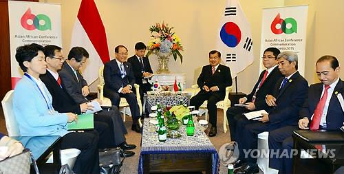 △ 황우여 사회부총리 겸 교육부 장관(왼쪽)이 23일(현지시각) 인도네시아 자카르타에서 열리고 있는 60주년 기념 아시아-아프리카 정상회의에 참석, 유숩 칼라 인도네시아 부통령과 면담을 하고 있다.