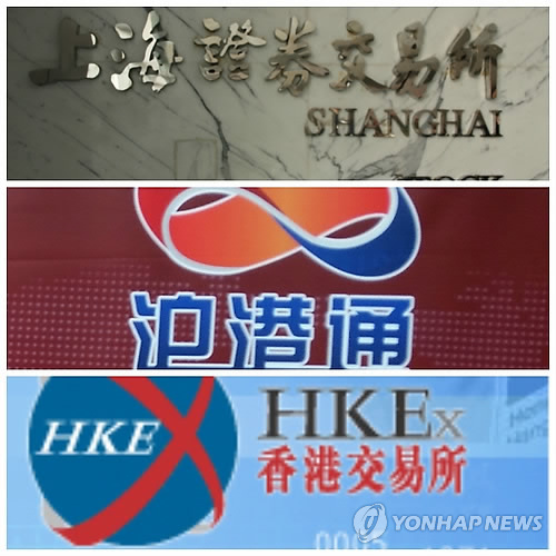 | △ 상하이-홍콩 증시 교차거래 '후강퉁' (상하이=연합뉴스) 한승호 특파원 = 중국이 17일 상하이 푸둥에 있는 상하이증권거래소에서 상하이 증시와 홍콩 증시 교차거래를 허용하는 '후강퉁 개통식'을 열고 후강퉁 시대의 개막을 알렸다 사진은 상하이증권거래소(상), 후강퉁(중), 홍콩증권거래소(하)의 로고. 2014.11.17 hsh@yna.co.kr |