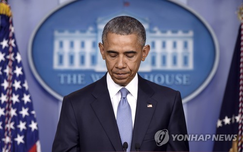 △ (AP=연합뉴스) 버락 오바마 미국 대통령이 23일(현지시간) 긴급 연설을 통해 인질 사망에 애도를 표시하면서 침통한 표정을 짓고 있다.
