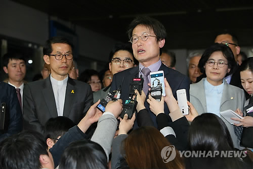 △ 기자회견하는 조희연 서울시교육감 (서울=연합뉴스) 박지호 기자 = 지난해 서울시 교육감 선거에서 상대 후보인 고승덕 변호사의 미국 영주권 보유의혹을 제기한 혐의로 기소된 조희연 서울시교육감이 23일 오후 서초동 서울중앙지법에서 열린 국민참여재판 1심 선고공판에서 유죄판결을 받은 뒤 기자회견을 하고 있다. 2015.4.23 jihopark@yna.co.kr