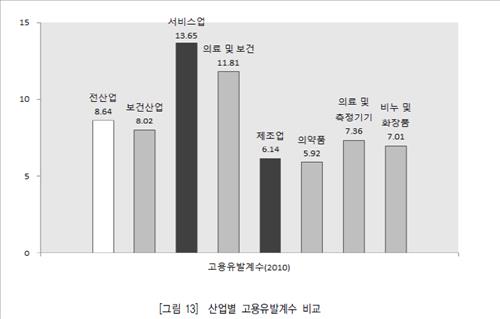 보고서 작성에 참여한 보건산업진흥원 신유원 연구원은 "고용유발계수는 제조업보다 인력이 많이 투입될 수밖에 없는 서비스업에서 높게 나타난다"며 "이런 특성 때문에 의료서비스 고용유발 효과가 높고 의약품 분야는 상대적으로 낮은 것"이라고 분석했다.