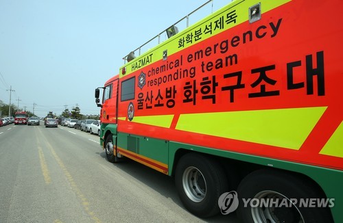 (울산=연합뉴스) 김근주 기자 = 24일 울산시 울주군 온산읍 현대중공업 온산공장 주변 기업체에서 근로자 수백 명이 정체불명의 가스를 흡입해 호흡곤란 증상과 메스꺼움을 호소하고 이 중 3명이 병원으로 이송됐다.