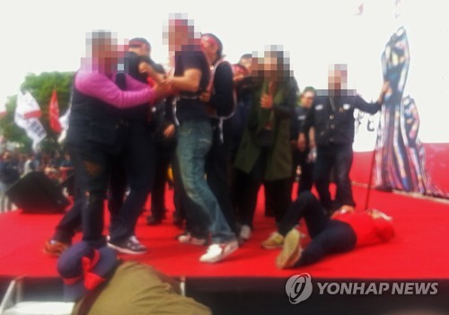 | △ 노조 간 충돌로 쓰러진 집회 참가자 (울산=연합뉴스) 24일 울산시 남구 태화강역 광장에서 열린 민주노총 파업 집회에서 한 참가자가 파업에 불참한 현대차 노조를 비판하는 발언을 하자, 행사에 참석한 현대차 노조 간부들이 이를 저지하면서 소란이 빚어졌다. 발언을 한 참가자가 사진 오른쪽 밑에 쓰러져 있다. 2015.4.24 << 독자 제공 >> yongtae@yna.co.kr |