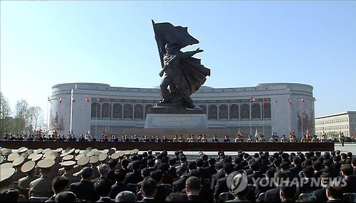 | △ 북한이 24일 평양 조국해방전쟁승리기념관(전승기념관)에서 인민군 창건 83주년(4월 25일) 경축 중앙보고대회를 연 모습으로 조선중앙TV가 보도했다. |