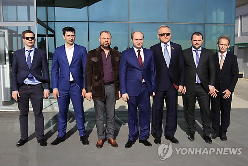 △ 알렉산드르 갈루슈카(가운데) 러시아 극동개발부 장관을 단장으로 한 러시아 경제대표단이 24일 평양의 순안 국제공항에 도착했다. 2015.4.25.<< 연합뉴스DB >>