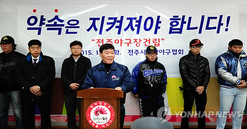 △ 전주야구협회 "야구장 건립 약속 지켜야" (전주=연합뉴스) 홍인철 기자 = 전북 전주시야구협회(회장 강우석)는 13일 시청에서 기자회견을 열고 "전주시는 야구장 건립 약속을 지켜야 한다"고 주장했다. 이는 야구장과 육상장 등을 이전·건립하는 대신 종합경기장에 컨벤션센터를 우선 건립키로 한 전주시의 결정에 대한 항의의 뜻으로 받아들여진다. 2015.1.13. DB. ichong@yna.co.kr