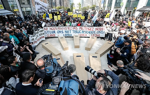 | △ (브뤼셀 EPA=연합뉴스) 23일(현지시간) 벨기에 브뤼셀에서 유럽연합(EU) 28개 회원국 정상들의 지중해 난민 대책회의가 열린 가운데 회의장 밖에서 시위대가 여러개의 관을 앞에 두고 시위를 벌이고 있다. 국제앰네스티(AI)가 계획한 이 시위에 난민 등 수십 명이 모여 지중해 난민 참사에 항의했다. |