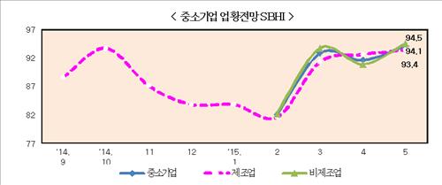 중소기업중앙회는 5월 중소기업 업황전망건강도지수(SBHI)가 94.1로 기준치인 100을 밑돌았다고 27일 밝혔다.