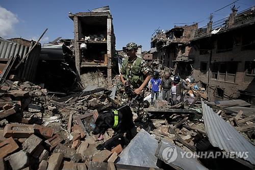 △ (카트만두 AP=연합뉴스) 이틀전 대지진이 강타한 네팔 수도 카트만두 교외 박타푸르에서 27일(현지시간) 구조대원이 탐지견과 함께 폐허 더미 사이를 살피며 지나고 있다. 지난 25일 발생한 지진으로 인한 사망자가 3천600명을 넘어선 가운데 카트만두와 인구 밀집지역인 주변 카트만두 계곡 주민 수만명이 집을 잃고 노숙자가 됐다.