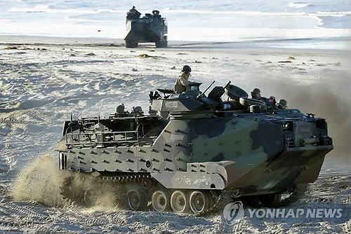 | △ (교도=연합뉴스) 미국 해병대와 일본 육상자위대는 2015년 2월 25일(현지시간) 미국 캘리포니아주에서 미군 수륙 양용차 'AAV7'을 활용한 대규모 낙도 탈환 훈련을 실시했다. 훈련에 투입된 수륙양용 장갑차 AAV7이 해변에서 작전을 수행하는 모습이다. |