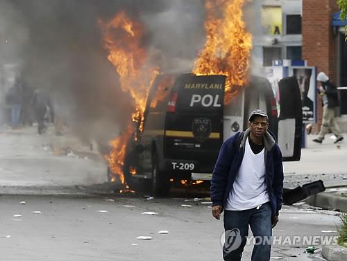 (워싱턴=연합뉴스) 심인성 특파원 = 미국 메릴랜드 주 볼티모어에서 구금 중 사망한 흑인 프레디 그레이(25)의 장례식이 열린 27일(현지시간) 항의시위 참가자들이 경찰과 충돌해 방화와 약탈 등 폭력 사태로 번졌다.