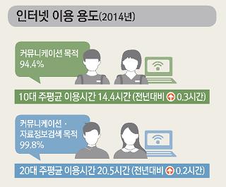 청소년들의 인터넷 사용 빈도는 여전히 높아 하루에 1회 이상 사용한다는 답변이 10대는 95.2%, 20대는 99.3%에 이르렀다. 주 평균 인터넷 이용시간은 10대는 14.4시간 20대는 20.5시간이었다. 하루 평균 2~3시간은 인터넷을 사용한다는 의미다.