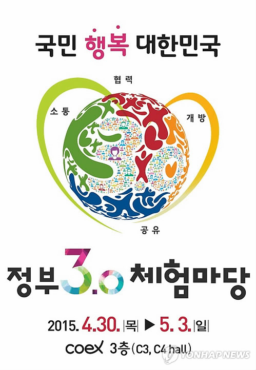 △ (서울=연합뉴스) 행정자치부는 44개 중앙행정기관과 17개 시도가 정부3.0의 공감대를 확산하고 지난 2년여의 추진 성과를 소개하는 '정부3.0 체험마당'을 오는 30일부터 나흘간 코엑스에서 개최한다고 28일 밝혔다. 정부3.0이란 공유·개방·소통·협력의 원리에 따라 부처·기관 간 칸막이를 제거해 맞춤형 대국민 서비스를 구현하고 창조경제에 기여하는 박근혜 정부의 정부혁신전략을 일컫는다. 2015.4.28 << 행정자치부 제공 >> photo@yna.co.kr
