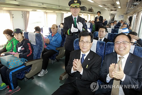 △ (청주=연합뉴스) 충북 최남단인 영동군과 최북단인 단양군을 잇는 충북 종단열차가 운행 1주년을 앞두고 있다. 사진은 운행 첫날인 지난해 5월 1일 청주역에서 이 열차에 탄 이시종(오른쪽에서 두번째) 지사. 2015.4.28