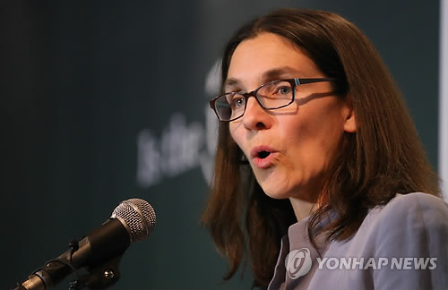 △ 질문에 답하는 알렉시스 더든 코네티컷대 교수 (서울=연합뉴스) 최재구 기자 = 알렉시스 더든 미국 코네티컷대 교수가 28일 서울 하얏트호텔에서 열린 아산플래넘에서 기자회견을 하며 질문에 답하고 있다. 2015.4.28 jjaeck9@yna.co.kr