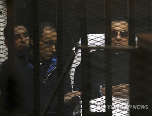 △ 철망 안 들것에 누워 선고 기다리는 무바라크 (AP=연합뉴스) 2011년 민주화 시위를 유혈진압한 혐의로 기소된 호스니 무바라크 전 이집트 대통령이 29일(현지시간) 카이로 외곽 경찰학교 특별법정에서 선고 공판이 진행되는 동안 철망이 쳐진 피고인실 안에서 들것에 누워있다. 옆에 무바라크의 아들 가말(왼쪽 두번째)의 모습도 보인다. 이날 카이로 형사법원은 무바라크에게 무죄를 선고했다. marshal@yna.co.kr (AP Photo/Tarek el-Gabbas)