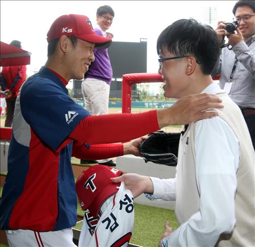 | △ 김성민(오른쪽)이 28일 광주-KIA 챔피언스필드에서 KIA 타이거즈 투수 윤석민과 만나 대화하고 있다. <<KIA 타이거즈 제공>> |