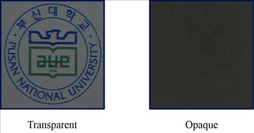 | △ 투명 LCD로 만든 광셔터. 전기를 공급하지 않은 상태에서는 투명한 상태(왼쪽)를 유지해 아래에 있는 부산대 마크가 선명하게 보이지만 전기를 공급하면 투명 LCD 내부에서 광흡수와 광산란이 동시에 일어나 불투명한 검은색으로 변한다. |