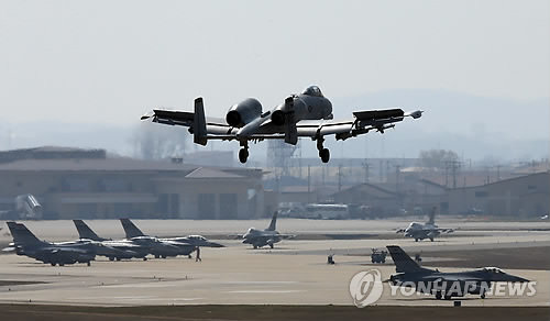 | △ 착륙하는 A-10 (평택=연합뉴스) 배정현 기자 = 3일 오후 경기 평택시 오산 미공군기지에서 A-10 항공기가 착륙하고 있다. 2013.4.3 doobigi@yna.co.kr |