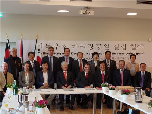 | △ 한국문화국제교류운동본부(이사장 박갑수) 특별기구인 '아리랑파크추진위원회'(위원장 강성구) 관계자들이 딘스라켄시청에서 시장과 로벡광산 사장이 참가한 가운데 한독우호 아리랑 공원 설립에 관한 MOU를 체결하고 기념촬영하고 있다. |