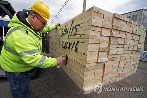 △ (피츠버그<미 펜실베이니아주> AP=연합뉴스) 지난달 31일 미국 펜실베이니아 주 피츠버그의 한 목재 공장에서 노동자가 출하될 목재에 생산정보를 표시하고 있다. 미국 상무부는 지난 1분기 국내총생산(GDP) 성장률이 0.2%라고 발표했다. 이는 1%였던 전문가들의 예상치에 크게 뒤지는 값이다.