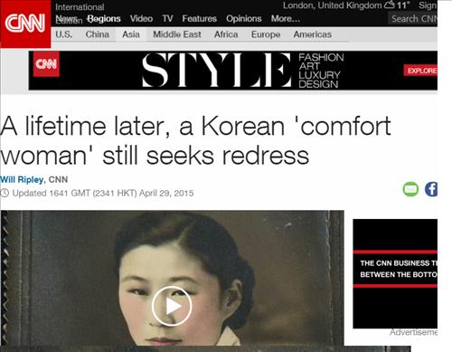 CNN은 홈페이지에서 '일본군 위안부 피해자인 한국인 할머니가 평생에 걸쳐 잘못된 역사의 시정을 촉구하고 있다'는 기사를 싣고 김 할머니의 사연을 다뤘다.