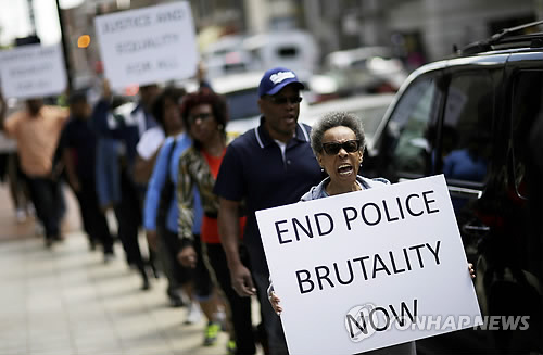 △ "볼티모어 경찰 폭력 종식하라" (볼티모어 AP=연합뉴스) 흑인에 대한 경찰의 과잉대응을 규탄하는 미국 볼티모어 소요사태가 계속되는 가운데 29일(현지시간) 시위자들이 구금과정에서 숨진 프레디 그레이 사건에 대해 추가 수사를 요구하고 있다.