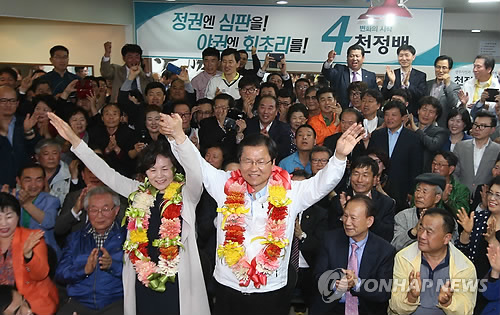 | △ 환호하는 천정배 (광주=연합뉴스) 형민우 기자 = 4·29 광주 서구을 보궐선거에 출마한 무소속 천정배 후보가 29일 오후 광주 서구 금호동 선거사무소에서 당선이 확실시되자 부인 서의숙씨와 함께 손을 들어 환호하고 있다. 2015.4.29 minu21@yna.co.kr |