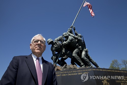 | △ David Rubenstein, a businessman and philanthropist, visits the U.S. Marine Corps War Memorial, in Arlington, Va., Wednesday, April 29, 2015. The famous bronze U.S. Marine Corps War Memorial overlooking Washington that depicts Marines raising the American flag at Iwo Jima during World War II has begun turning green with age but now will be restored with a $5.37 million gift. Philanthropist David Rubenstein announced Wednesday that he will give the National Park Foundation the funds needed to wash, wax and restore the memorial and its plaza and landscaping. Improvements are also planned for the memorial's signage and access for handicapped visitors. The project will also restore the memorial's engravings to be much brighter. (AP Photo/Jacquelyn Martin) |