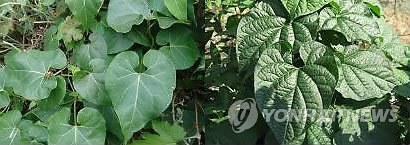| △ 사진 왼쪽은 백수오 잎으로 단면이 매끄러우며, 오른쪽은 이엽우피소 잎으로 단면이 거칠다. (제주도 농업기술원 제공) |