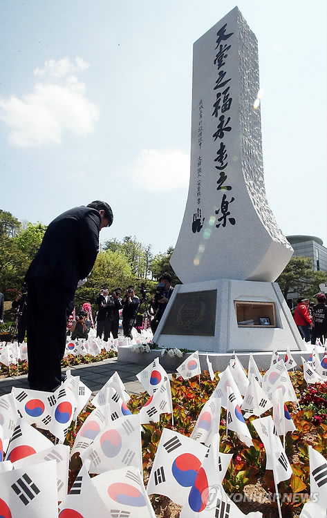 △ 안중근 장군 추모비 제막 (안성=연합뉴스) 신영근 기자 = 30일 오전 경기도 안성시 유토피아추모관 평화광장에서 안중근평화재단 청년아카데미와 안중근장군추모비건립위원회의 '안중근 장군 추모비 제막행사'가 열려 제막된 추모비 앞에서 참가자들이 헌화 후 묵념하고 있다. 높이 6m, 넓이 3m 크기의 추모비에는 안 의사가 생전에 남긴 글귀 중 하나인 '天堂之福 永遠之樂(천당지복 영원지락·천당의 복이 영원한 즐거움이다)'이 새겨졌다. 2015.4.30 drops@yna.co.kr
