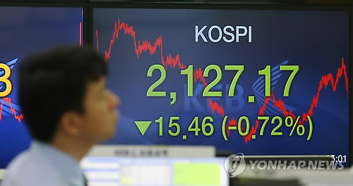 코스피 지수는 전날보다 15.46포인트(0.72%) 내린 2,127.17로 장을 마쳤다.