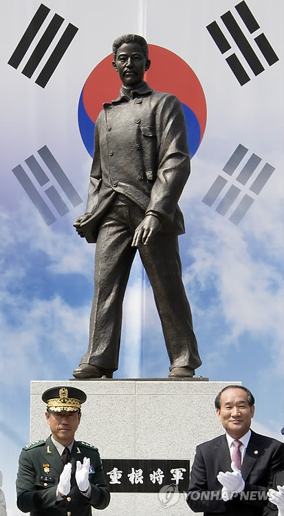 △ 우뚝 선 안중근 장군 동상 (서울=연합뉴스) 윤동진 기자 = 1일 오전 서울 노원구 육군사관학교에서 박승춘 국가보훈처장(오른쪽)과 양종수 육군사관학교장이 안중근 장군 동상 제막식을 한 뒤 박수를 치고 있다. mon@yna.co.kr
