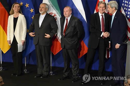 △ 지난달 2일 스위스 로잔에서 이란 핵협상 잠정 합의안 타결을 발표하고 있는 협상 대표들. 왼쪽부터 페데리카 모게리니 유럽연합(EU) 외교안보 고위대표, 모하마드 자바드 자리프 이란 외교장관, 러시아 측 대표, 필립 해먼드 영국 외교장관, 존 케리 미국 국무장관. 2015.5.1 (EPA=연합뉴스 자료사진)
