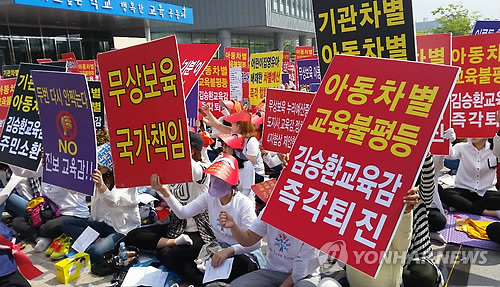 (전주=연합뉴스) 최영수 기자 = 전북어린이집연합회 회원 3천여명은 1일 전북도교육청 광장에서 '김승환 교육감 주민소환 총력투쟁 결의대회'를 열어 어린이집 누리과정(만 3∼5세 무상교육)에 대한 예산 편성을 거듭 촉구하면서 자신들의 요구가 이뤄지지 않을 경우 주민소환을 통해 김 교육감 퇴진운동을 벌여나가겠다고 밝혔다.