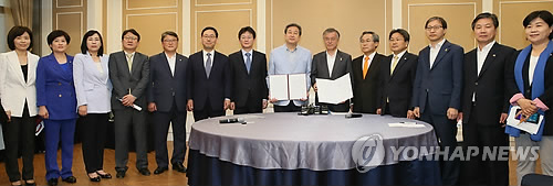 | △ 여야, 공무원연금개혁 합의 (서울=연합뉴스) 진성철 기자 = 여야 대표 및 원내대표, 공무원연금개혁특위 위원들이 2일 국회에서 '공무원연금 개혁 및 국민연금 강화를 위한 양당 대표 합의문'을 발표하고 있다. 왼쪽 부터 민현주, 강은희, 김현숙, 이종훈, 조원진, 주호영, 유승민, 김무성, 문재인, 우윤근, 강기정, 김성주, 홍종학, 서영교. |