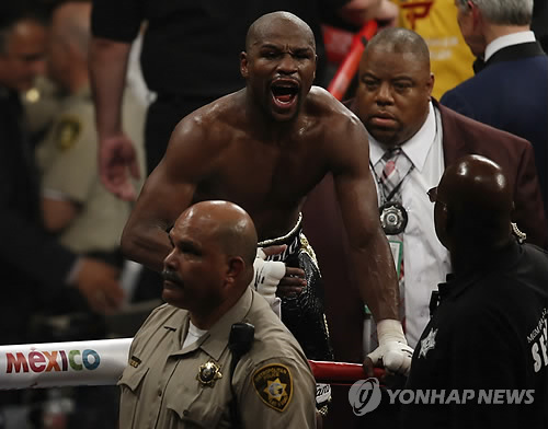 | △ 내가 이겼어! (라스베이거스 AP=연합뉴스) 플로이드 메이웨더 주니어가 2일(현지시간) 미국 라스베이거스 MGM 그랜드가든 아레나에서 펼쳐진 '세기의 복싱 대결'에서 매니 파키아오에게 판정승을 거둔 뒤 포효하고 있다. marshal@yna.co.kr |