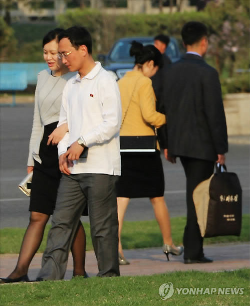 | △ 다정한 평양의 연인 (서울=연합뉴스) 최근 평양을 방문했다는 미국의 친북 웹사이트 '민족통신' 노길남 대표는 "북녘 청년 학생들이 다정하게 손을 잡고 거니는 모습이 지난 시기에 비해 눈에 많이 띈다"며 북한 젊은이들의 교제 행태가 변하고 있다고 전했다. 사진은 평양 시내에서 다정하게 걷고 있는 젊은 연인의 모습. 2015.5.1 nkphoto@yna.co.kr |