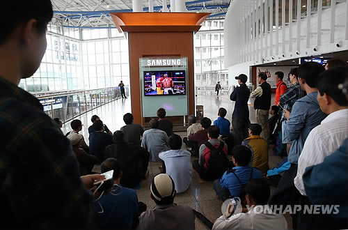 | △ 메이웨더 vs 파키아오 '세기의 대결' 지켜보는 시민들 (서울=연합뉴스) 전수영 기자 = 8체급을 석권한 '살아있는 전설' 매니 파키아오(37·필리핀)와 47전 47승 '무패의 복서' 플로이드 메이웨더 주니어(38·미국)의 세계복싱평의회(WBC)·세계복싱기구(WBO)·세계복싱협회(WBA) 웰터급 통합 타이틀전이 열린 3일 오후 서울역 대합실에서 시민들이 미국 라스베이거스의 MGM 그랜드가든 아레나에서 열린 경기를 TV를 통해 지켜보고 있다. 메이웨더 심판전원 판정승. 2015.5.3 swimer@yna.co.kr |
