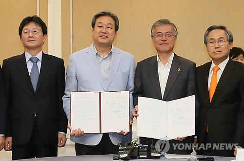 △ 새누리당 유승민 원내대표(왼쪽부터), 김무성 대표, 새정치민주연합 문재인 대표, 우윤근 원내대표가 지난 2일 국회에서 '공무원연금 개혁 및 국민연금 강화를 위한 양당 대표 합의문'을 발표하고 있다.