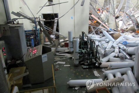 | △ 폭발 사고 현장 (아산=연합뉴스) 4일 오후 1시 37분께 충남 아산시 음봉면 한 산업용가스 생산업체에서 질소 가스를 충전하는 과정에서 용기가 폭발하는 사고가 발생했다. 폭발 충격으로 건물 천장 마감재 일부가 무너져 있다. 이 사고로 이 회사 소속 근로자 1명이 숨지고, 1명이 다쳤다. << 충남소방본부 >> |