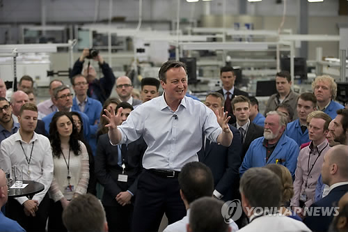 | △ (런던 AP=연합뉴스) 영국 보수당의 데이비드 캐머런 총리가 총선을 1주일여 앞둔 4월 28일(현지시간) 런던 북부의 해군 전술 레이더 시스템 제작사 켈빈 휴즈를 방문, 근로자들을 상대로 유세를 펼치고 있다. 영국 총선은 5월 7일 치러진다. |