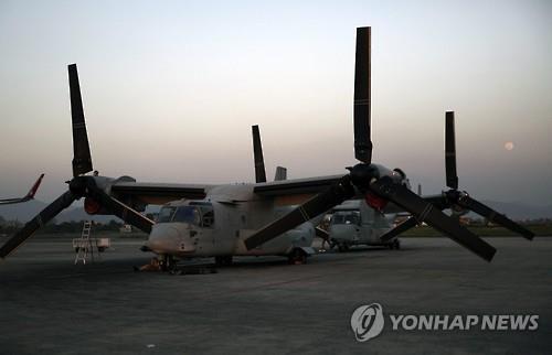 △ 3일(현지시간) 네팔 카트만두 트리부반 공항에 도착한 미국 해병대 V-22 오스프리 수직이착륙 수송기(EPA=연합뉴스)