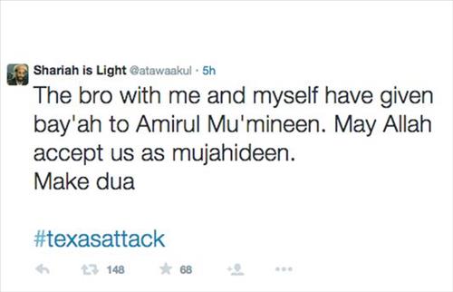 심프슨은 이슬람 경전인 꾸란에 기초한 이슬람 율법을 뜻하는 샤리아를 사용해 '샤리아는 빛'이라는 이름으로 "알라가 우리를 무자히딘(성스러운 이슬람 전사)으로 받아들일 것"이라는 글을 행사장 습격 직전 트위터에 썼다.