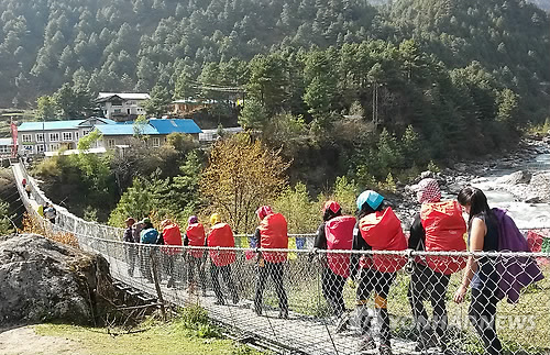 | △ 네팔 등정 '경기도 줌마탐험대' 전원 무사 (수원=연합뉴스) 대지진이 발생한 네팔 칼라파타르산(5천550m) 등정에 나섰던 '2015 경기도 줌마탐험대' 31명은 모두 무사, 한국 시간 27일 팍딩(2천500m) 지점까지 하산한 것으로 알려졌다. 사진은 줌마탐험대가 지진 발생 전 등정에 나서는 장면. 2015.4.27 << 경기도 제공 >> drops@yna.co.kr |