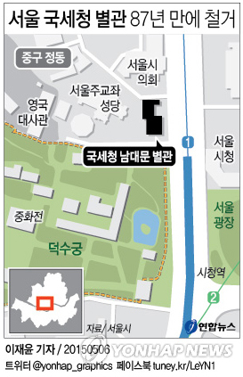 (서울=연합뉴스) 황희경 기자 = 광복 70주년을 맞아 일제가 덕수궁 내부를 볼 수 없게 하려고 지었던 국세청 별관이 87년 만에 철거되고 그 자리에 임시 광장이 조성된다.