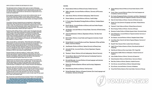 | △ 세계 역사학자 187명 집단성명 "아베 '위안부' 과거사 왜곡말라" (워싱턴=연합뉴스) 노효동 장재순 김세진 특파원 = 퓰리처상을 받은 허버트 빅스(미국 빙엄턴대학), 디어도어 쿡·하루코 다야 쿡(미국 윌리엄 패터슨 대학), 존 다우어(미 매사추세츠공과대학)를 비롯해 에즈라 보겔(하버드대), 브루스 커밍스(시카고대), 피터 두스(스탠포드대) 등 세계적으로 저명한 역사학자들이 6일(현지시간) 아베 신조 일본 총리에게 일본군 위안부 문제와 관련한 역사적 사실을 왜곡하지 말고 정면으로 인정할 것을 촉구하는 집단성명을 발표했다. 이 성명은 외교경로를 통해 아베 총리에게도 직접 전달됐다. 사진은 공개서한 일부 캡쳐. 2015.5.6 rhd@yna.co.kr |